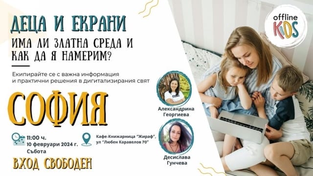 на 10.02.2024г от 11:00 часа Фондация „Офлайн Кидс“ / Offline Kids и Жираф Кафе-Kнижарница ви канят на Деца и екрани: Има ли златна среда и как да я намерим? Събитието ще се проведе в Кафе-книжарница „Жираф“.