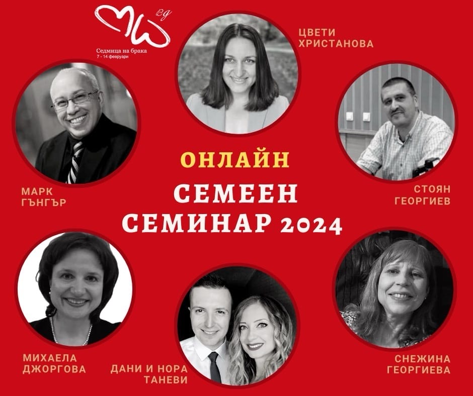 Семеен семинар 2024 От 7 до 14.02.2024 се проведат осем вечери на живо, между 19 и 20 ч. онлайн по ZOOM. Сесиите имат за цел, не просто да информират, а да запалят в семействата постоянен копнеж, за изграждането на здрав любящ съюз. Те ще са достъпни до края на февруари, а билетът за тях включва достъп до сесиите на миналогодишното издание на семинара. Повече за събитието вижте оттук