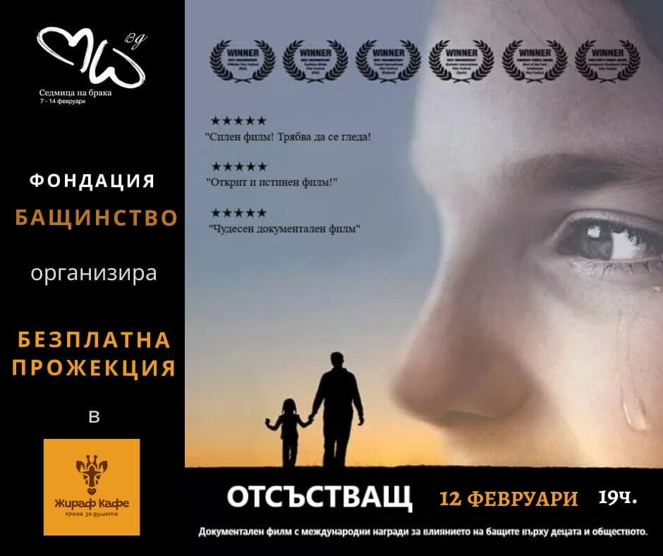 На 12.02.2024г. /понеделник/ от 19:00ч. фондация „Бащинство“ ви кани на БЕЗПЛАТНА прожекция на филма „Отсъстващ“ в София. Това е един от най-добрите документални филми за по взаимоотношенията деца – бащи.