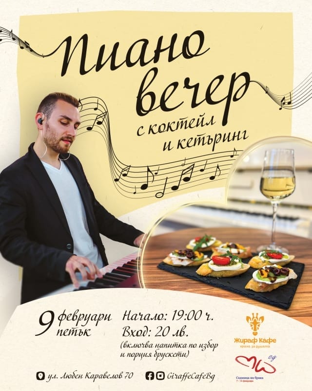 На 9 февруари 2024 г.от 19:00-21:00 в Кафе-книжарница „Жираф“ ви канят на Пиано вечер с напитка и кетъринг – Иван Касабов– за фон ще има пиано инструментал от Иван Касабов.