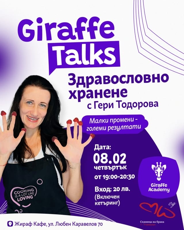 На 08.02.24 от 19:00-21:00 Кафе-книжарница „Жираф“, ви кани наедно много специално събитие, „ОТ ЛЮБОВ КЪМ СЕБЕ СИ -пълноценен и здравословен начин на хранене – въпрос на навик“.