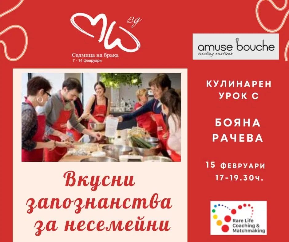 На 15.02.2025 г. от 17:00 ч. Rare Life Coaching & Matchmaking и Кулинарно Училище Amuse Bouche ви канят на „Вкусни запознанства“. Те ще ви поведат в готвене в екипи по двама – смесени двойки на живо в София. Ще получите кулинарен урок от опитен инструктор, всички продукти, необходими за приготвяне на ястията, подробни инструкции и съвети за готвене и много други. Повече за събитието може да намерите оттук